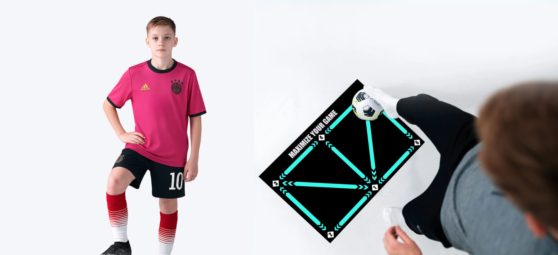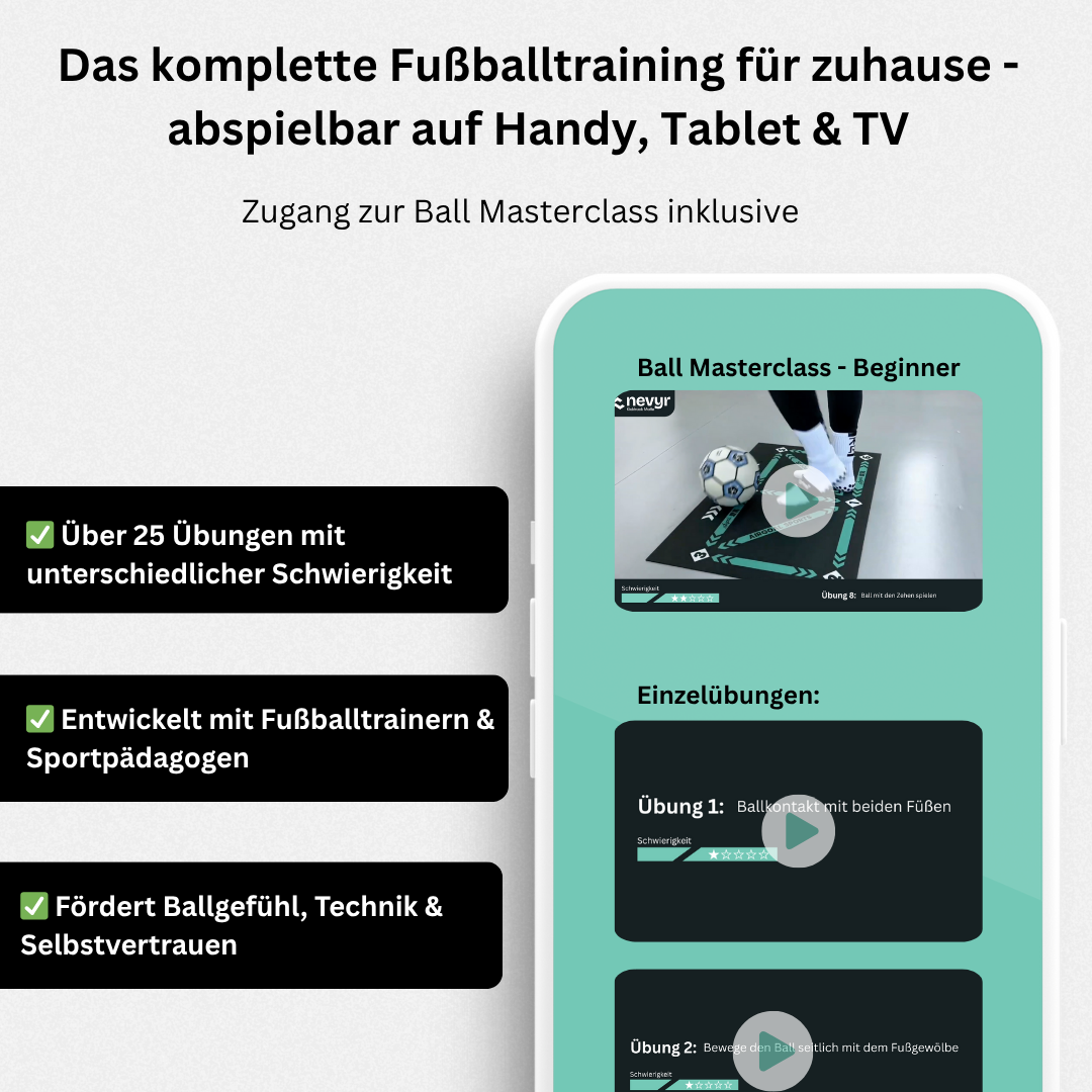 Mit der Nevyr Kicktrack Matte und der digitalen Ball Masterclass trainiert dein Kind nicht nur effektiver, sondern mit echtem Plan.